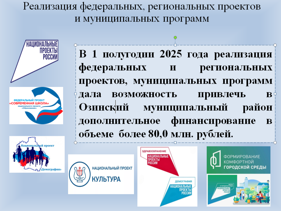 С докладом выступила глава ОМР А.А. Галяшкина. Итак, развитие экономики района в отчетном периоде осуществлялось в соответствии с целями, задачами и приоритетами, определенными Указами Президента Российской Федерации, основными направлениями которых являются устойчивый экономический рост и улучшение качества жизни населения. Особое внимание уделялось реализации мероприятий, направленных на достижение целей и задач, поставленных в рамках федеральных, региональных и муниципальных составляющих национальных проектов, что позволило привлечь в район дополнительное финансирование в объеме почти 80 млн рублей.