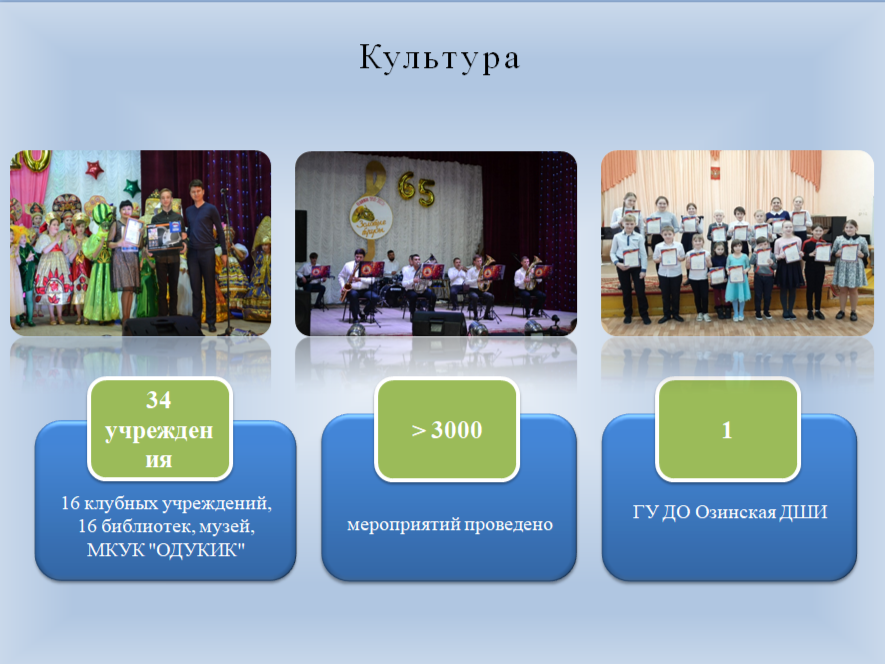 Культурный потенциал, представленный 16 клубными учреждениями, 16 библиотеками, государственным учреждением дополнительного образования «Детская школа искусств», Озинским историко-краеведческим музеем, используется как важный инструмент для патриотического воспитания подрастающего поколения и повышения имиджа района.