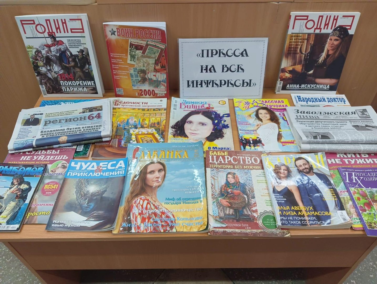 По этому случаю для разновозрастных читателей была оформлена журнально-газетная выставка «Пресса на все интересы», которую представили такие печатания, как «Рыболов», «Вокруг света», «Славянка», «Народный доктор», «Родина», «Заволжская нива», «Регион-64», «Приусадебное хозяйство», «Зимняя вишня», литературно-художественный журнал «Воин России» и многие другие, включая публикации про путешествия, научные гипотезы и фантастику.