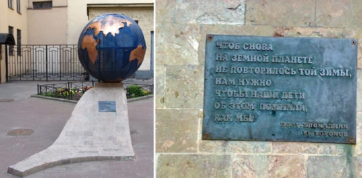 Некоторые из них мне удалось посетить в одну-единственную поездку, в которую невозможно было «впихнуть невпихуемое». Но все же мне хочется поделиться с читателями тем, что удалось повидать самой. На Невском проспекте на доме № 14 установлена мемориальная доска с надписью: «Граждане! При артобстреле эта сторона улицы наиболее опасна!» Эта надпись на доме спасала жизни людей во время войны. До сих пор она – как напоминание о том, что когда-то с неба на Ленинград летели снаряды… Представить до конца этого не сможет никто из ныне живущих – сейчас это непостижимо. А тогда, когда город стоически держался, это было реальностью. На Невском проспекте во дворе дома № 14 установлен глобус. На постаменте памятника высечены строки стихотворения поэта Юрия Воронова, который подростком пережил блокаду: