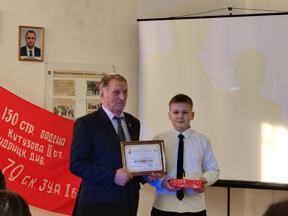 Экскурсоводы, получившие сертификаты участников конкурса: ученица шестого класса МОУ «СОШ р.п. Озинки» Давыдкина Александра, посвятившая экскурсию Сталинградской битве, в которой участвовали земляки-озинцы; участница патриотического клуба «Бекет» Зарина Рудь - рассказала о Бобруйской операции, проводившейся под командованием генерала К.К. Рокоссовского в июне 1944 года; учащийся шестого класса МОУ «СОШ р.п. Озинки» Клим Канцев - посвятил урок истории битве за Севастополь; Князева Ирина (8 класс п. Модин) - член патриотического кружка «Факел» Чалыклинского СДК повествовала о нашем земляке, генерале армии, герое Советского Союза И.И. Масленникове и битве за Кавказ; ученик 4-го класса МОУ «СОШ р.п. Озинки» и самый юный конкурсант Ишангалиев Альтемир рассказал про нашего земляка-разведчика Каиргазы Имашева, в честь которого названа улица райцентра. Миссию по вручению детям наград выполнил П.И. Романчук. Всем конкурсантам были вручены сладкие подарки от местного отделения партии «Единая Россия», а призы лидерской тройке предоставил Совет ветеранов войны и труда и правоохранительных органов в лице председателя Кудиновой Г.А.
