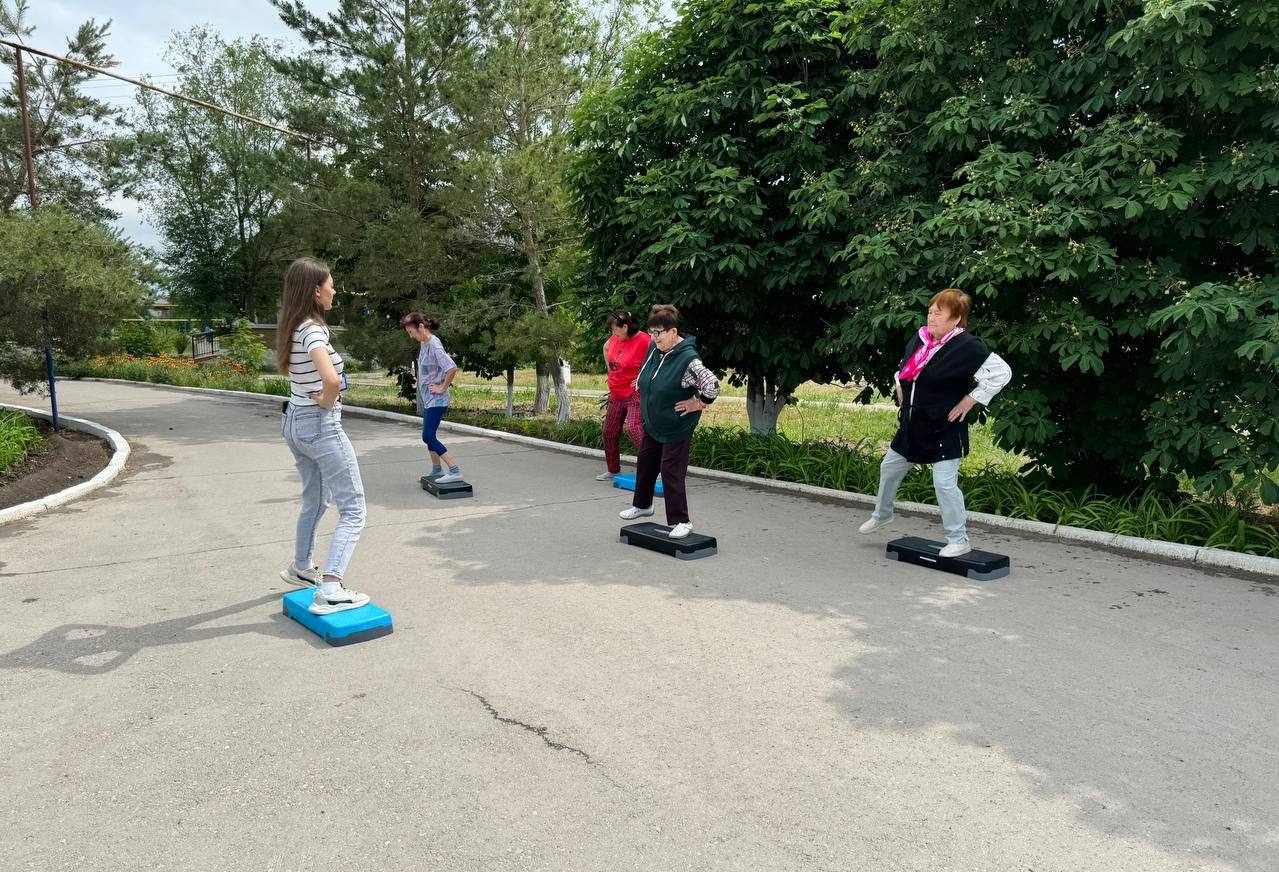 В комплексном центре соцобслуживания населения Озинского района для получателей социальных услуг организовано групповое занятие адаптивной физкультурой на свежем воздухе на степ-платформах и с бодибарами.