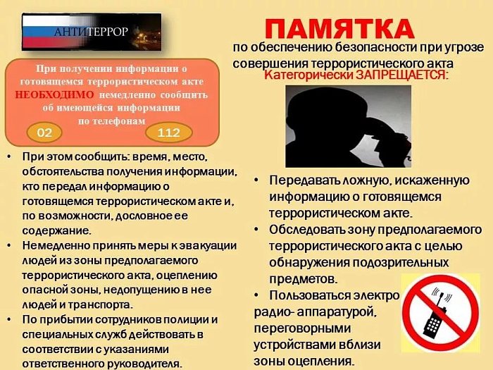 - Если вам известна информация о возможном террористическом акте, немедленно сообщите в правоохранительные органы или специализированные службы по реагированию на чрезвычайные ситуации.