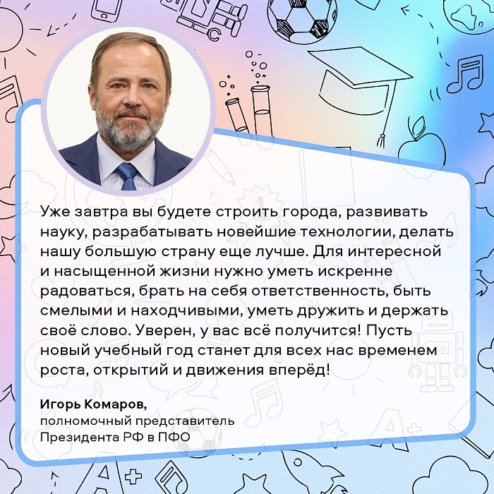 «Уважаемые жители Приволжского федерального округа, дорогие ребята!Прошел ещё один год, закончилось лето — и снова в школу! 1 сентября — это встречи с друзьями, новые лица и новые знания. Для вас, ребята — это продолжение учебы, для родителей, бабушек и дедушек — еще один повод для гордости вашими успехами, для ваших учителей — новые вызовы.