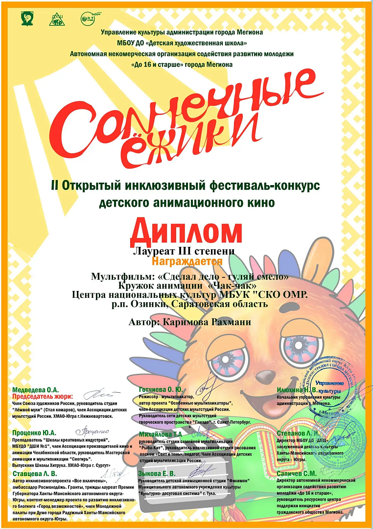 Недавно они завоевали Дипломы II и III степени в II Открытом инклюзивном фестивале-конкурсе детского анимационного кино «Солнечные Ёжики» — 2026!