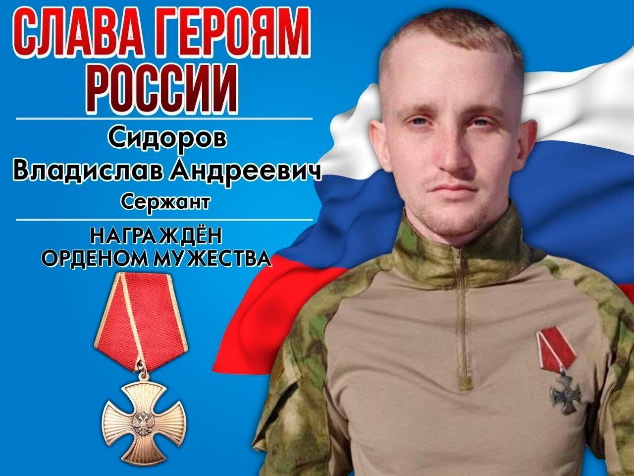 Сержант Владислав Андреевич Сидоров за мужество и героизм был награжден орденом Мужества. Однажды в 3 часа ночи их группе поступила команда, что надо приехать на позиции и сменить товарищей. Они приехали на место, вели наблюдение за противником. К утру прибыла подмога, обговорив план наступления на опорный пункт. В 6 утра трое человек шли впереди и разминировали дорогу, оставшиеся семь шли сзади. Когда ребята начали подходить ближе к опорному пункту противника, один из бойцов, Виктор Цицер, сел разминировать растяжку и в этот момент раздалась пулемётная очередь: Виктор упал на землю. Ребята сразу же рассредоточились: кто за дерево, кто за ветки, вступили в бой. Стали массово стрелять в сторону противника. В это время кричали раненому солдату, чтобы он полз к ним. Он смог приблизиться, но потерял сознание. В этот момент, не имея времени на раздумье, сержант Сидоров выполз из укрытия и спас жизнь 19 летнему парнишке из Оренбурга, вытащив его на себе в укрытие.