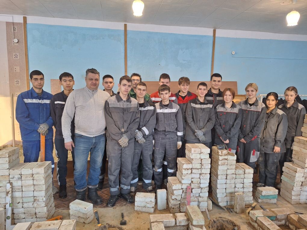 Из кабинета директора мы в сопровождении Н.В. Горбуновой и Ю.А. Ермолаевой отправились в учебный цех, где в это время как раз шло практическое занятие по кирпичной кладке. Здесь царила совершенно иная, деятельная атмосфера. В воздухе пахло глиной и цементом, а главным звуком был ровный стук мастерков о кирпич. Мастер производственного обучения Виктор Викторович Сергеев показывал ребятам, как правильно замешивать раствор и выверять каждый ряд кладки с помощью уровня. Те самые студенты, с которыми я только что беседовала, теперь сосредоточенно работали руками. Было видно, что в техникуме создана отличная база для практики: от кирпича и раствора до современного станка для резки кирпича и измерительных инструментов. Здесь теория оживала, превращаясь в уверенные, профессиональные движения. В соседней аудитории ребята учатся отделочным работам: как натягивать потолки, подвесить армстронг, обшить стены современным материалом, сохраняя тепло.