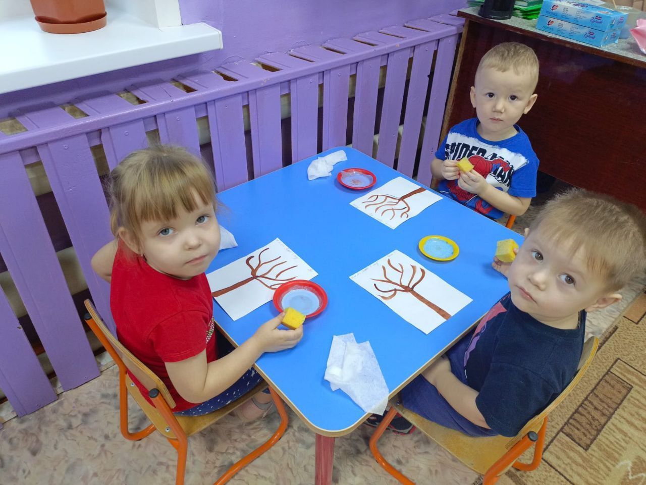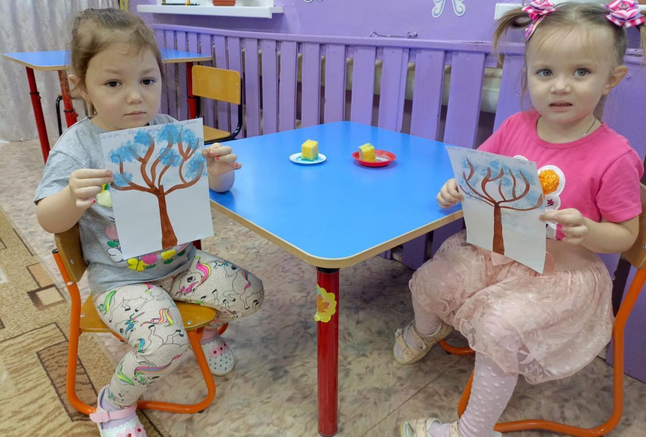 Воспитатель Кульшуманова А.Б. предложила использовать нетрадиционную технику работы рисования методом тычка губкой, чтобы учить малышей новому художественному навыку.