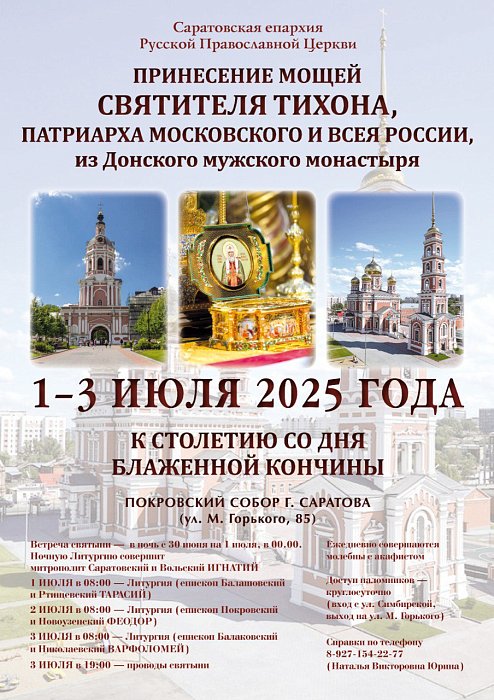 В ночь на 1 июля в Покровский собор Саратова прибудут мощи святителя Тихона, Патриарха Московского и Всероссийского, из Донского мужского монастыря. В полночь в соборе начнется Божественная литургия. Доступ к святыне будет открыт круглосуточно. Ежедневно будут совершаться молебны с акафистом. Ковчег будет пребывать в соборе до 19.00 3 июля.