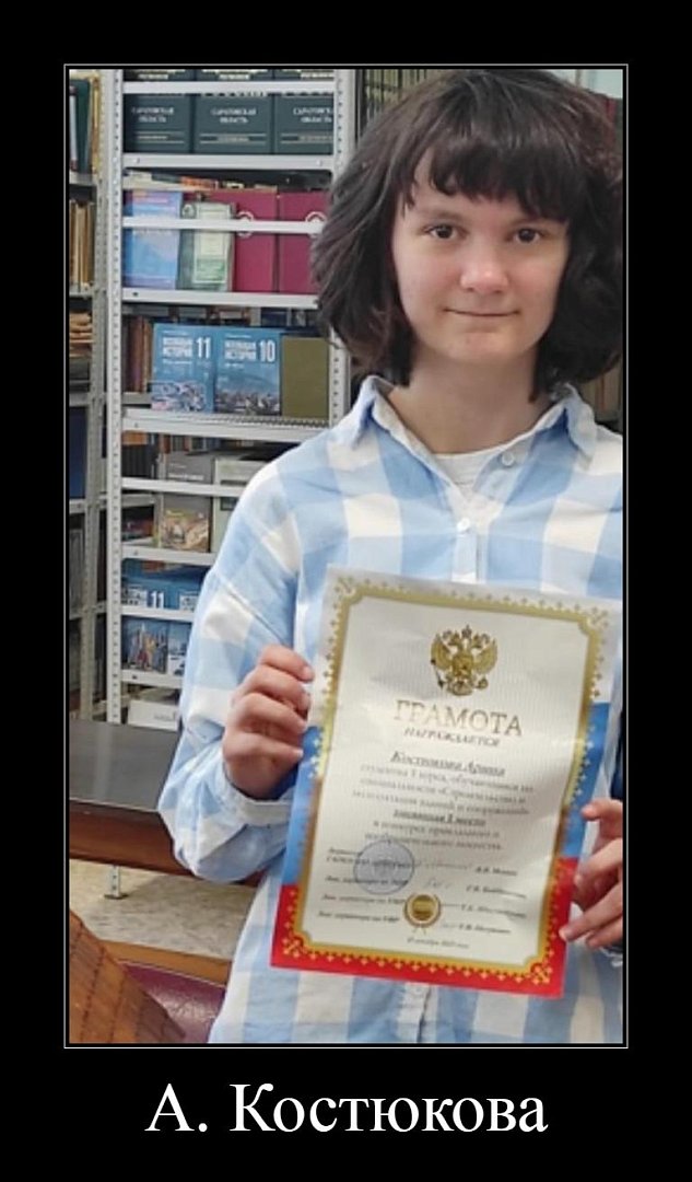 У каждого человека есть определенные способности к чему-либо. Среди студентов Озинского техникума тоже есть талант, которую зовут Арина Костюкова. В этой скромной, немногословной первокурснице таится невероятный дар. Её работы отличаются прекрасной композицией, конструкцией и цветом, они оригинальны и отмечены печатью индивидуальности. Как будущий строитель, она удивительно тонко подмечает детали, видит объект под каким-то другим углом. В конкурсе изобразительного и декоративно-прикладного творчества Арина заняла первое место. Студентка любит что-то мастерить своими руками и это всегда ей приносит большое удовольствие.
