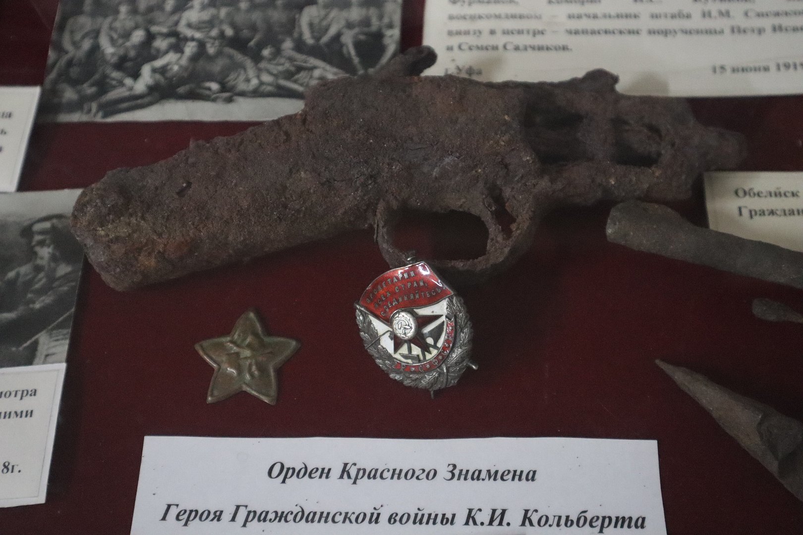 Но самое главное, мы продолжали встречи с участниками войны, записывали их воспоминания на магнитофонную ленту, жаль, но те ленты были еще не долговечны, плохо хранящиеся. Материал накапливался. С ним я и пошла в райком партии. И, по инициативе третьего секретаря райкома партии Батиной В.Д., в школе (новое здание школы), в кабинете истории были построены выставочные полки, застекленные коробки для размещения краеведческого материала. Как мы гордились теперь нашим школьным музеем, появились предметы старинного быта, отпечатки раковин и растений на камушках, которыми мостилась первая дорога, значки разных лет. Главной гордостью стал орден Красного Знамени, принадлежавший Кольберту Константину Ивановичу. С этим экспонатом произошел случай, чуть не погубивший наше рвение. Однажды утром обнаружили его пропажу, кошмар красной пеленой застил глаза. Краеведы побежали по классам, рассказывая историю героя Гражданской войны, его награды, увещевая, чтобы просто отдали орден, ибо это не значок, а правительственная награда. И, о чудо, на следующее утро Орден был на своем месте. Кто, почему, как – вопросы остались без ответа. Теперь это экспонат нашего местного краеведческого музея.